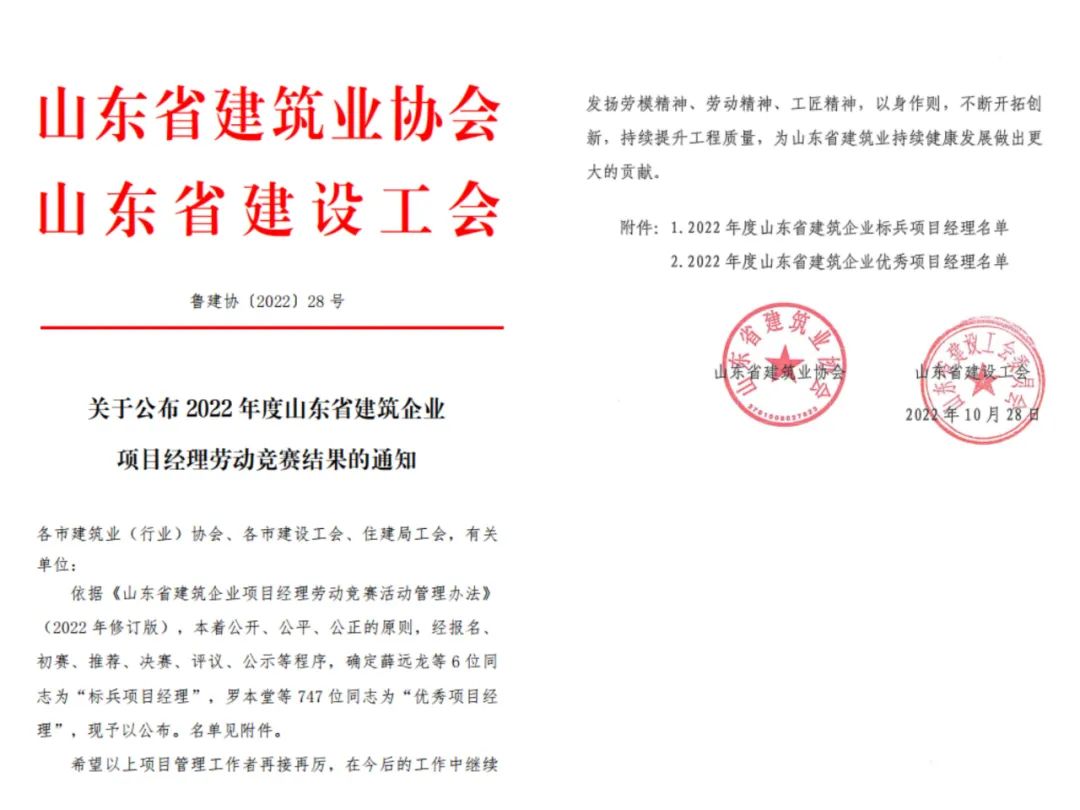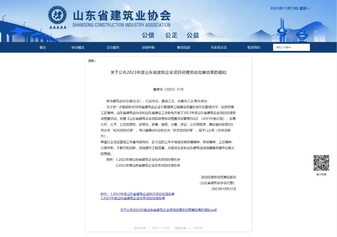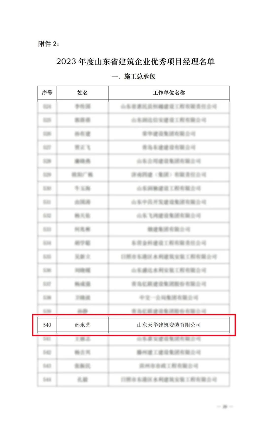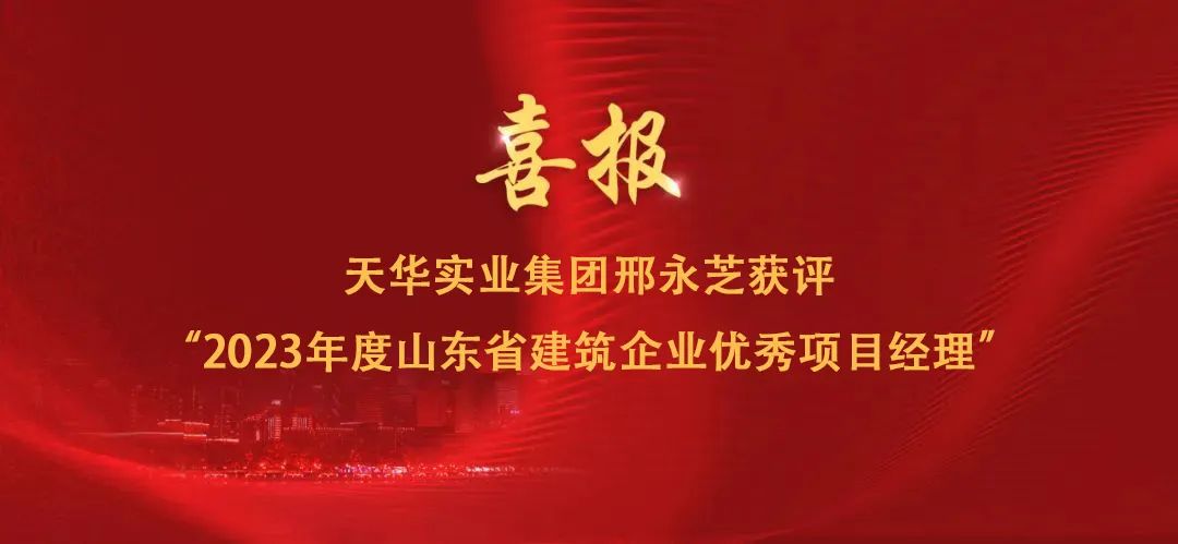 近日,山東省建筑業(yè)協(xié)會發(fā)布了《關于公布2023年度山東省建筑企業(yè)項目經理勞動競賽結果的通知》,天華實業(yè)集團邢永芝獲評“2023年度山東省建筑企業(yè)優(yōu)秀項目經理”。