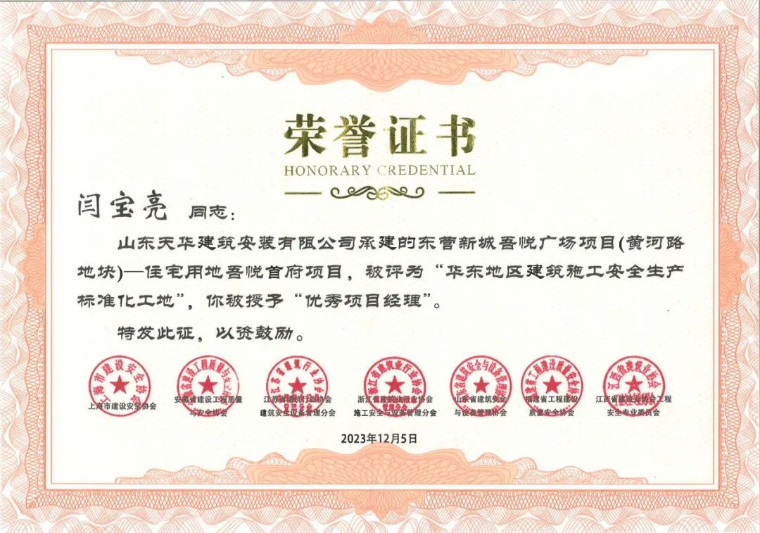 近日,山東省建筑安全與設(shè)備管理協(xié)會(huì)傳來(lái)喜訊,由天華實(shí)業(yè)集團(tuán)承建的吾悅首府項(xiàng)目被評(píng)為“華東地區(qū)建筑施工安全生產(chǎn)標(biāo)準(zhǔn)化工地”,同時(shí)授予項(xiàng)目負(fù)責(zé)人閆寶亮“優(yōu)秀項(xiàng)目經(jīng)理”稱號(hào)。