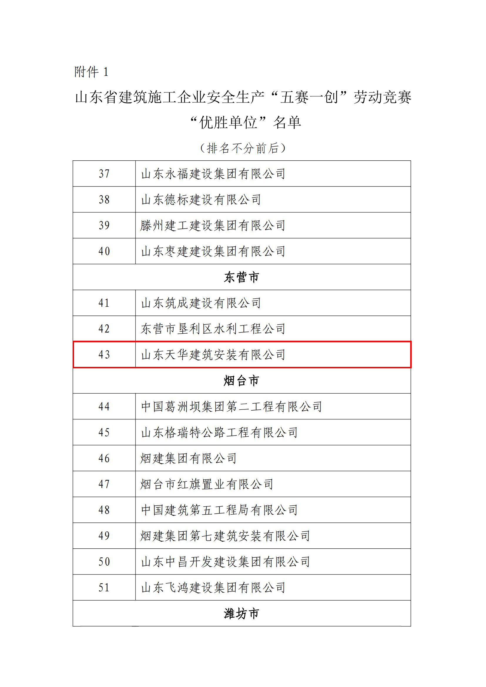 經(jīng)基層預(yù)賽、市級選拔、省級決賽,山東天華建筑安裝有限公司榮獲“山東省建筑施工企業(yè)安全生產(chǎn)‘五賽一創(chuàng)’勞動競賽‘優(yōu)勝單位’”稱號。